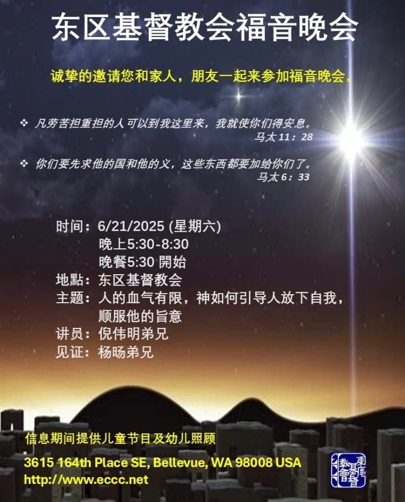 东区基督教会位於美国华盛顿州西雅图东边的贝尔优 (A Seattle Chinese Church in Bellevue), 成立於一九八五年,是根据圣经,信仰耶稣基督的教会。我们的教会不属於任何宗派,信徒来自不同背景.欢迎各地的弟兄姐妹和朋友一起来敬拜神,参加主内团契,同心广佈基督救恩.