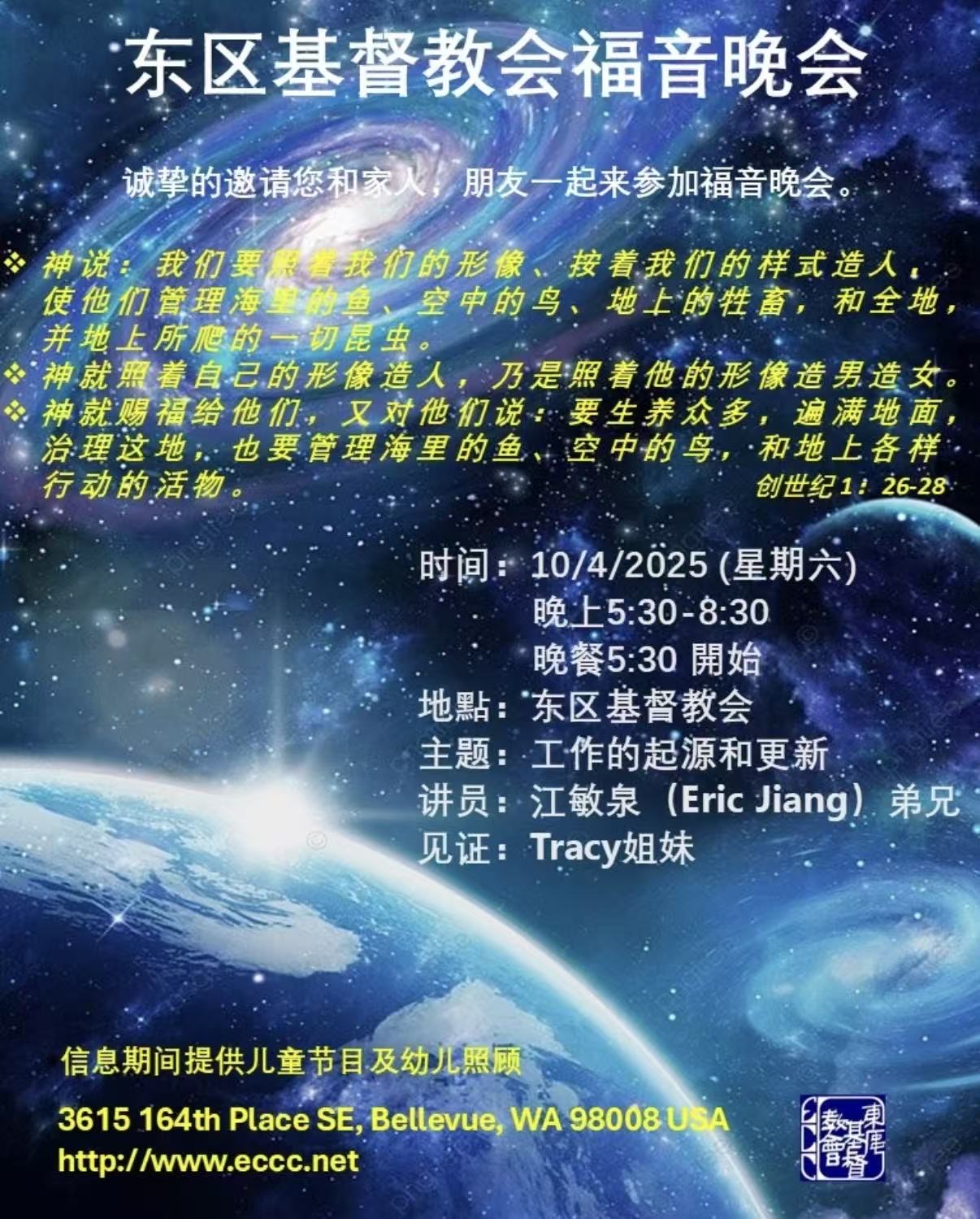 親愛的朋友: (國語聚會) 講題: 工作的起源和更新 講員:江敏泉弟兄 見証:譚建紅姐妹
